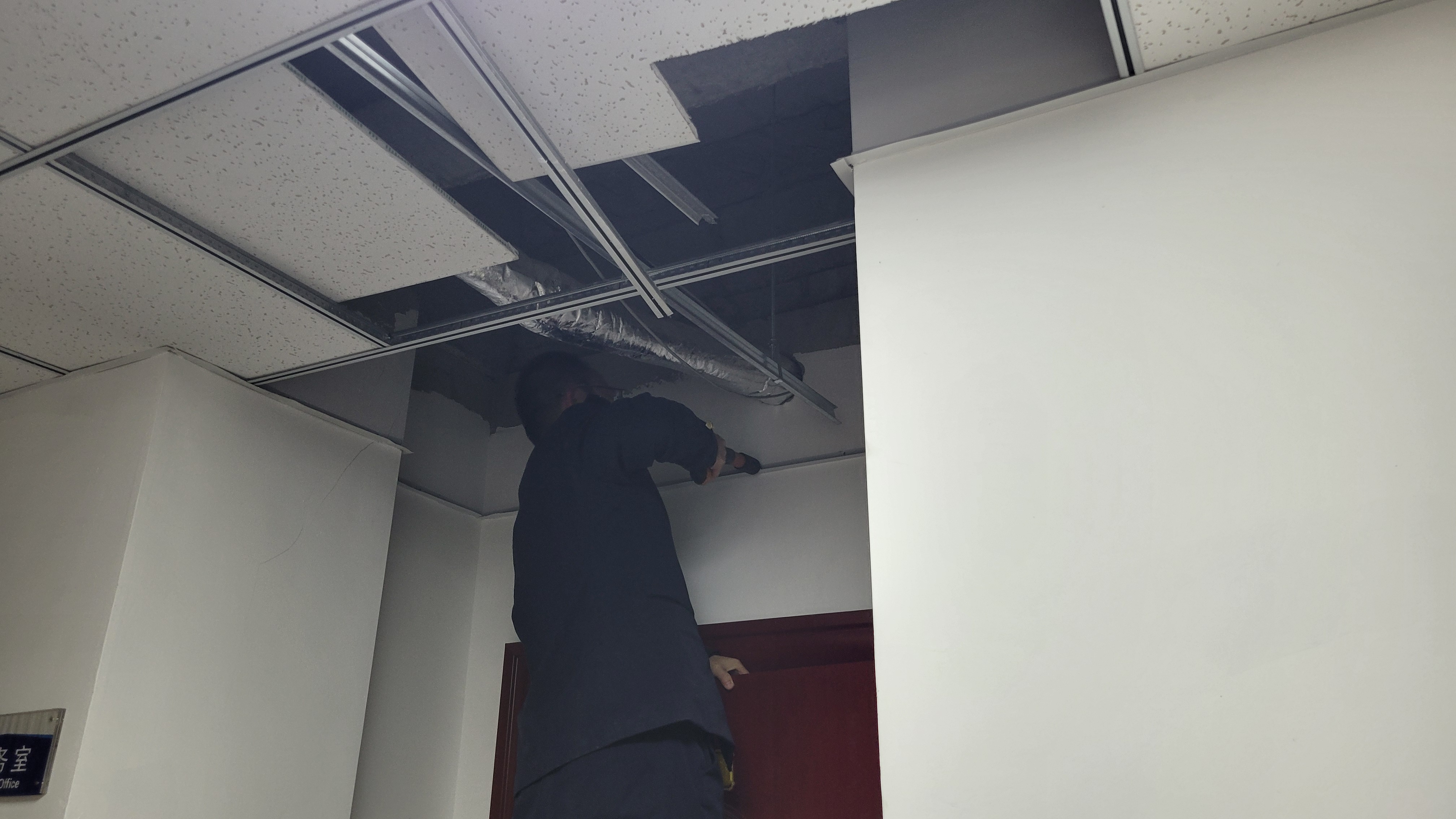 维修过程中,大家分工协作,配合默契,有的职工仔细勘察龙骨结构,测量尺寸,规划修复方案,有的职工迅速清点库存,找来同规格天花板、龙骨、螺丝等材料。大家规范操作,细心拆除破损吊顶、固定龙骨、安装新板材,全程规范有序。经过近一个小时的紧张忙碌,脱落天花板位置房顶顺利修复,安全隐患被彻底排除。
