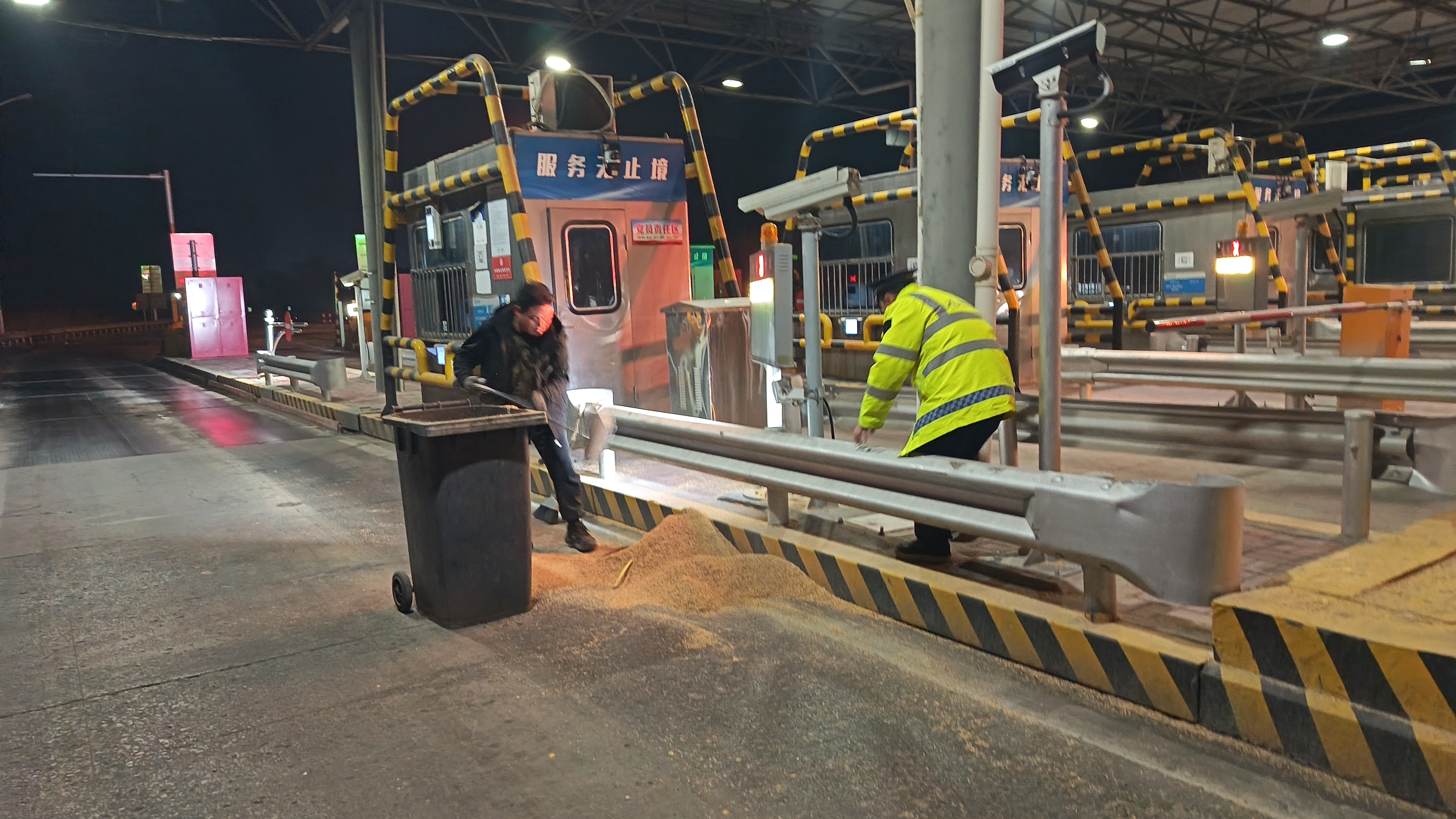 3月7日凌晨2点45分左右,南皮站副站车道突然传来“砰”的一声,一辆货车所载货物不慎散落一地,而驾驶员并未察觉,依旧向前行驶。当班收费员赵峰发现情况后,迅速拦停驶出车道的货车。
