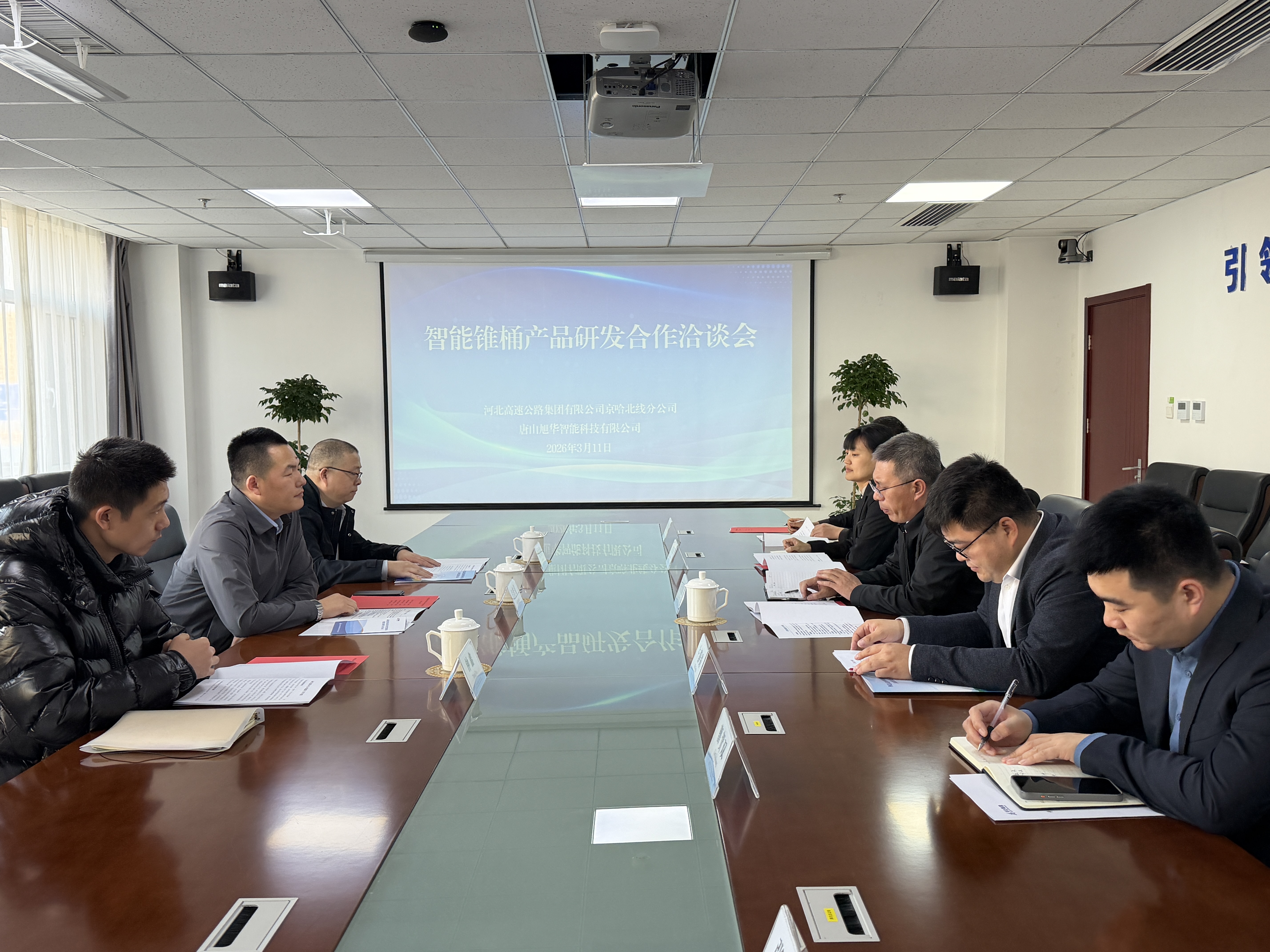 3 月 11 日,唐山旭华智能科技有限公司总经理闫梦强一行到访河北高速集团京哈北线分公司,分公司党委委员、副总经理闫俊荣及相关部室负责同志参加座谈。