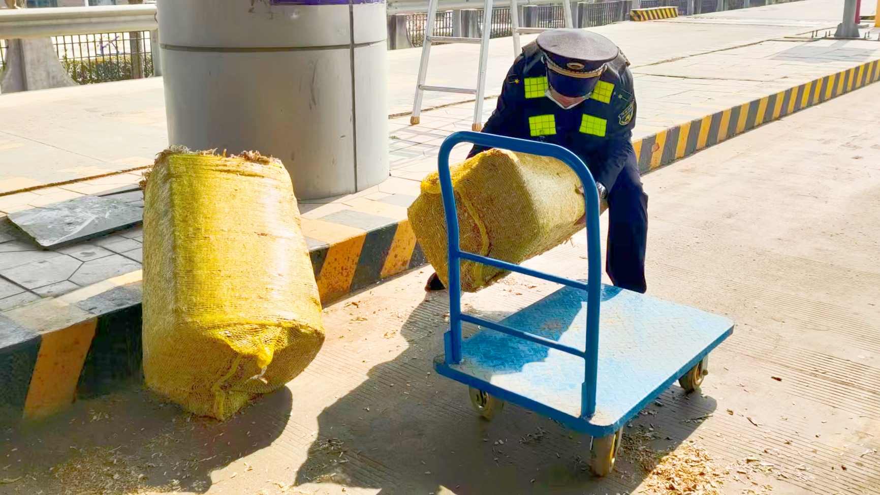 当班班长发现这一情况后,立即上前示意司机减速慢行,引导车辆安全驶出车道,停至外广场,避免车辆继续行驶对散落草料造成二次移位。随后,班长立刻取来推车,将散落的草料逐一归集、平稳运送至货车旁,又耐心协助司机将草料重新规整排列,细致检查每一处捆扎点,手持绳索反复加固,确保草料在后续运输中不会再次掉落。看着被妥善捆扎好的草料和班长忙碌的身影,司机感动不已,连连竖起大拇指称赞:“真是太感谢了!你们这么热心帮忙,还又快又稳妥。”