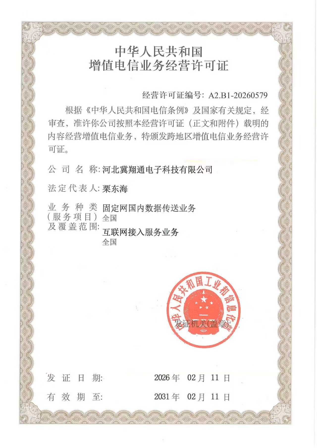 近日,经工业和信息化部严格评审,2026年2月11日正式获批冀翔通公司固定网国内数据传送业务、互联网接入服务业务两项电信业务经营许可资质。
