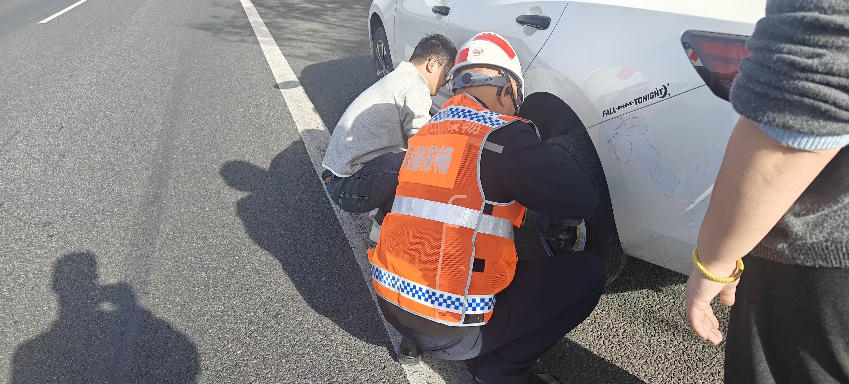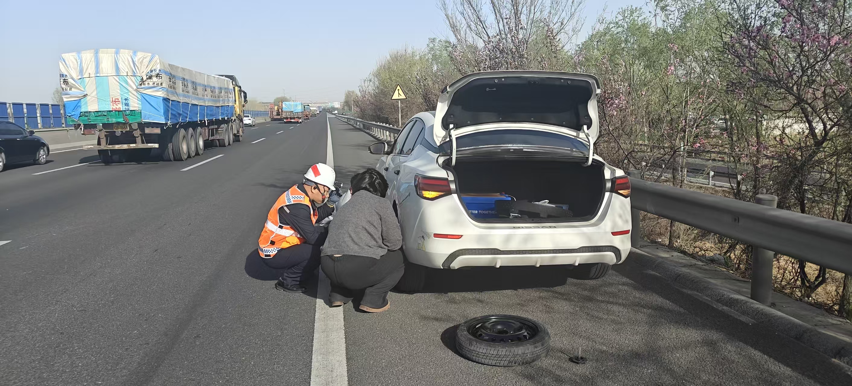 随后,保畅人员主动上前向司机询问具体情况。经了解,该司机驾车出行途中车辆突然爆胎,因自身完全没有更换轮胎的经验,面对故障车辆一筹莫展,只能将车停在应急车道。保畅人员一边耐心安抚司机情绪,告知其在高速应急车道停留的安全风险,提醒后续出行前务必检查车辆状况;一边迅速从车上取出工具,主动帮助司机更换破损轮胎。