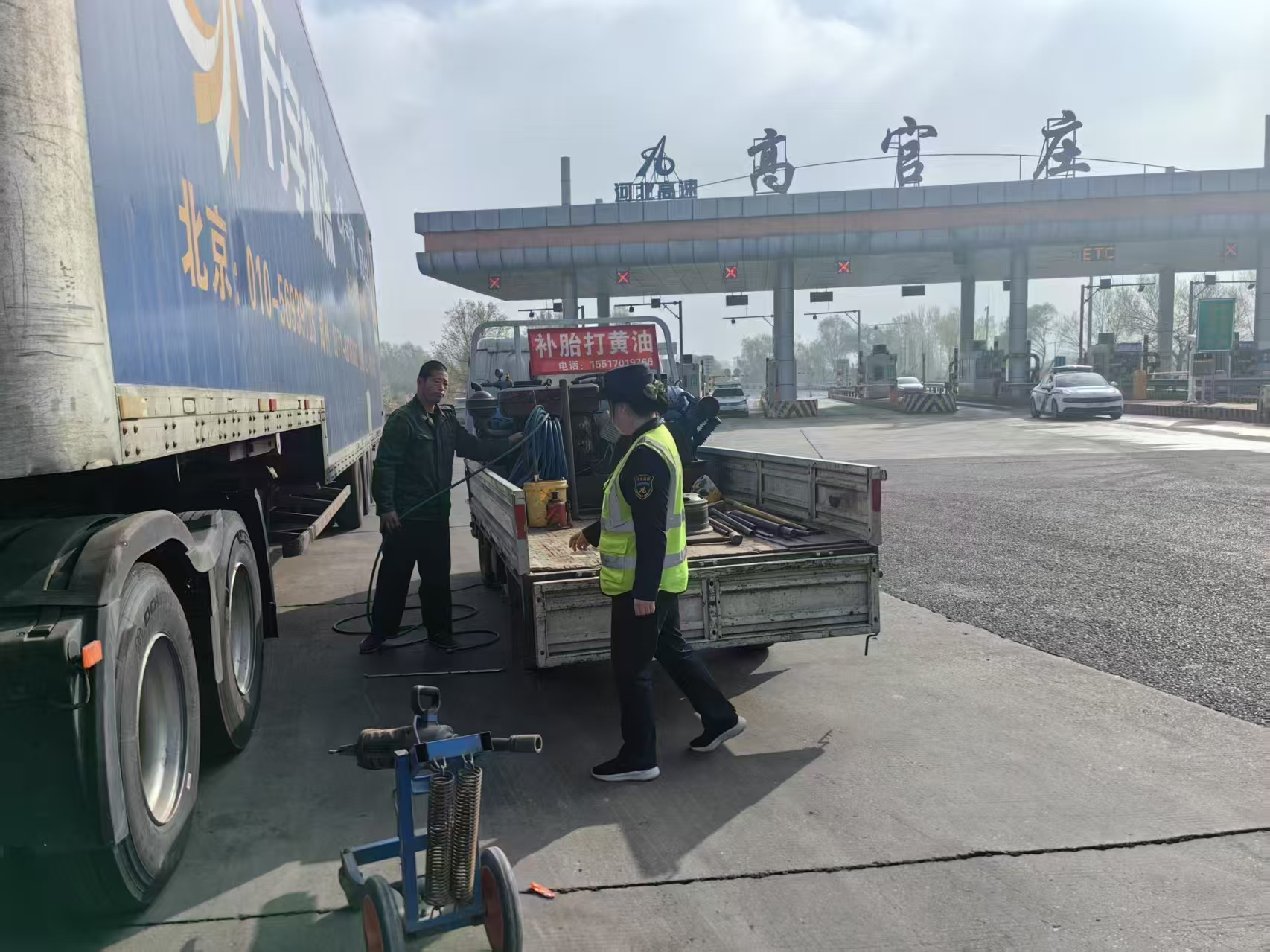 当班班长发现情况后,立即上前询问。在了解司机的困难后,她一边安抚司机情绪,一边迅速帮忙联系了附近一家距离最近流动补胎。考虑到货车停放位置靠近通行车道,存在安全隐患,他还组织收费员在车辆周围设置警示标志,确保现场安全。