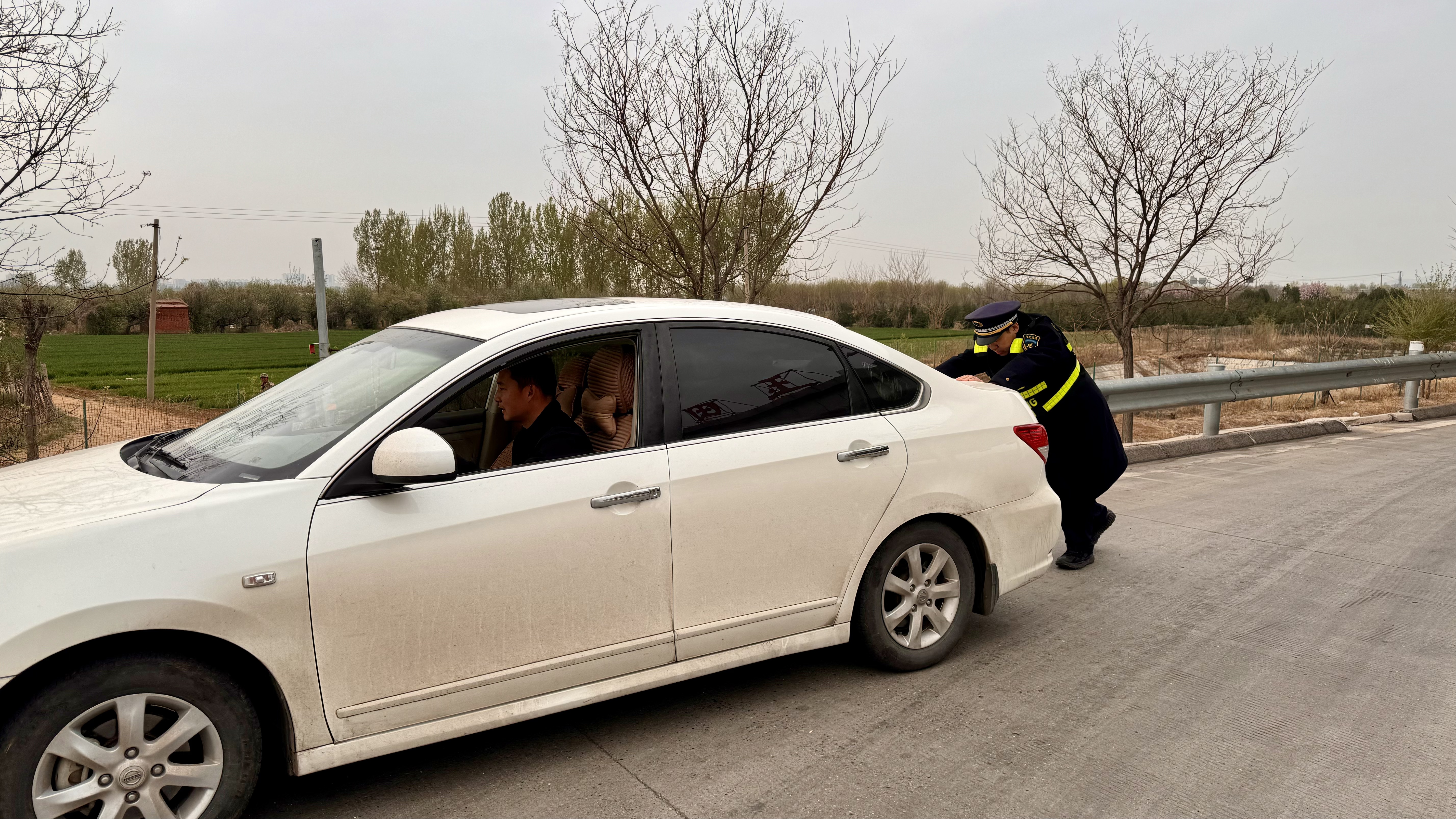 4月14日,一辆小客车在玉田城北收费站出站口突发故障,无法正常打火启动,车主焦急地找到收费站工作人员求助。