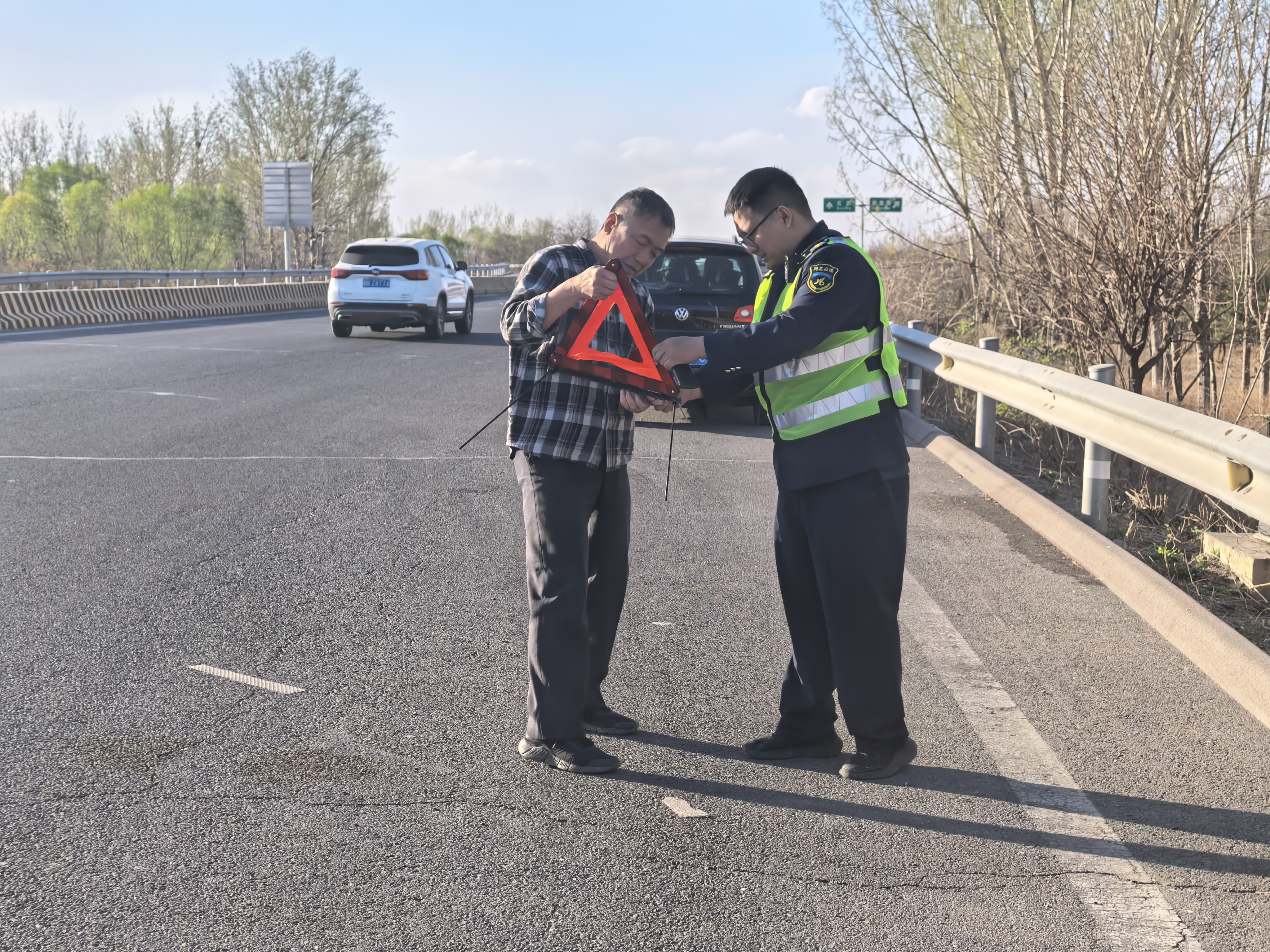 了解情况后,班长立即引导司机开启双闪、在车后规范放置三角警示牌,做好安全防护,同时现场开展安全宣教:高速入口内广场属于通行核心区域,车流量大、视线受限,哪怕短暂停车也极易引发剐蹭、追尾事故。并明确告知司机,如需等人,务必驶离高速、在站外下道安全区域等候,切勿拿生命冒险。