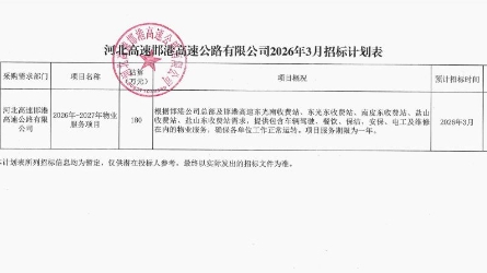 2026-03-24 08:51:56河北高速邯港高速公路有限公司2026年-2027年物业服务项目 招标公告 1.招标条件 本招标项目河北高速邯港高速公路有限公司2026年-2027年物业服务项目已列入河北高速邯港高速公路有限公司2026年度预算,项目业主单位为...[详细]