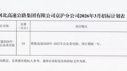 2026-04-10 08:49:50邯港高速(沧州段)一期2026年-2027年公众责任险项目 招标公告 1.招标条件 本招标项目邯港高速(沧州段)一期2026年-2027年公众责任险项目(以下简称“本项目”)已由江南登录网站京沪分公司确认。项目...[详细]