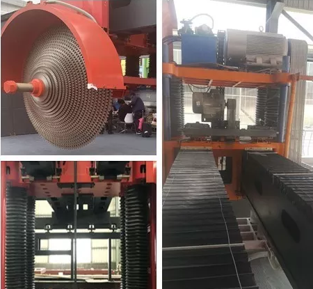 双梁龙门切石机具有以下特点: 1. 即可挂26片塔形片,又可挂13套大小片。片数更多,产量更高。相比常规多片桥切机,可实现产量翻2-3倍; 2. 根据实际操作需要,可同时摆放2-4颗荒料进行切割; 3. 超大行程,最大可切深1.6米,在一定程度上取代框架锯,切割成本是框架据的三分之一。投资更省,为客户创造更高价值; 4. 采用超薄锯片及高效节能的电机,实现了同样产量,能耗更低,相比常规多片桥切,综合成本可下降约30%; 5. 独有的双梁结构及厚重的机身,使得切割稳定性高,效果更好,精度更高,板面更平整,产量更高。