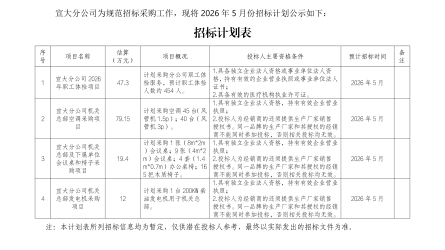 宣大分公司为规范招标采购工作,现将2026年5月份招标计划公示如下: 招标计划表 序号 项目名称 估算 (万元) 项目概况 投标人主要资格条件 预计招标时间 备注 1 宣大分公司2026年职工体检项目 47.3 计划采购分公司...[详细]